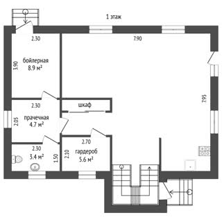 - 1 этаж: Гостиная; кухня; гардеробная; холл; гостевой сан узел; постирочная; бойлерная.