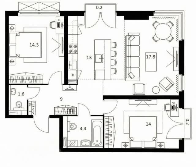 Огромная кухня-гостиная (30 м²), две уютные спальни для спокойного отдыха. квартира с новым ремонтом, из качественных современных материалов в стиле Неоклассика.