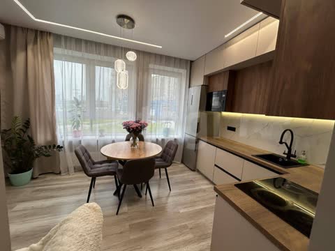 просторная кухня-гостиная, две спальни, теплый пол в кухне, ванной и туалете, современная сантехника и системы хранения, натяжные потолки с точечным освещением, современные межкомнатные двери, подсветка, вытяжка, водонагреватель.
