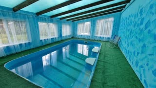 Ключевой особенностью является наличие крытого бассейна, который можно использовать круглогодично. На территории также расположен навес на два автомобиля и хозяйственные постройки для хранения инвентаря.